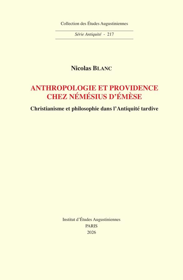 The De natura hominis of Nemesius, bishop of Emesa in Syria in Late Antiquity, has been studied above all for its sources (Philopator, Ammonius/Porphyry), its influence (Maximus the Confessor, John Damascene, Thomas Aquinas, etc.), or its anthropology. This apologetic treatise, however, contains unprecedented developments in ancient Christian literature on fate, self-determination and providence. This study aims to shed light on this important contribution, showing how the author redeployed certain conceptual and problematic networks of Greek philosophy in order to translate the specificities of the Christian conception of providence. His argument in favor of unconditioned divine sovereignty, of the immediacy of providence and of the existence of a special providence for man, marks a historical knot which fully inscribes this work in the genealogy of the notions of omnipotence and divine permission, and in the philosophical emergence of the subject and the free will.